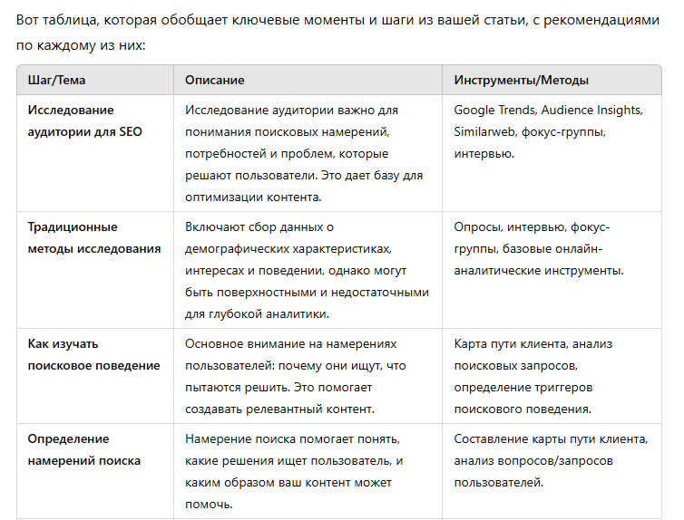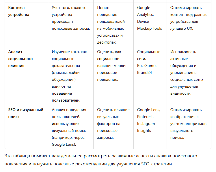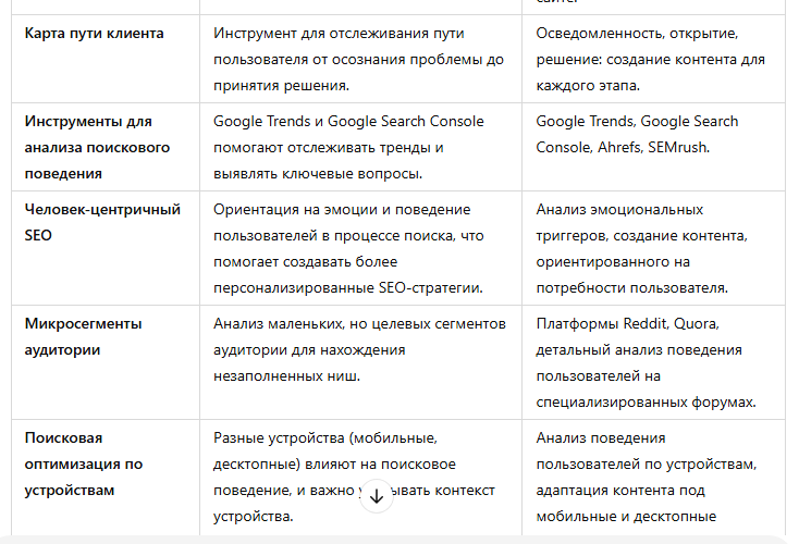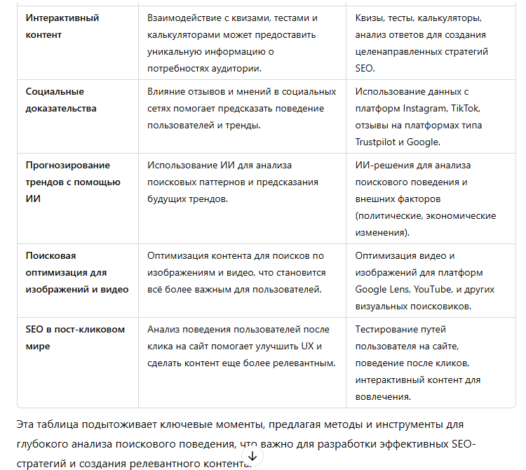 Эти дополнительные идеи помогают выйти за пределы традиционных методов исследования аудитории и дают более полное представление о том, как можно анализировать и оптимизировать поисковое поведение для достижения лучших результатов SEO-продвижения сайта.